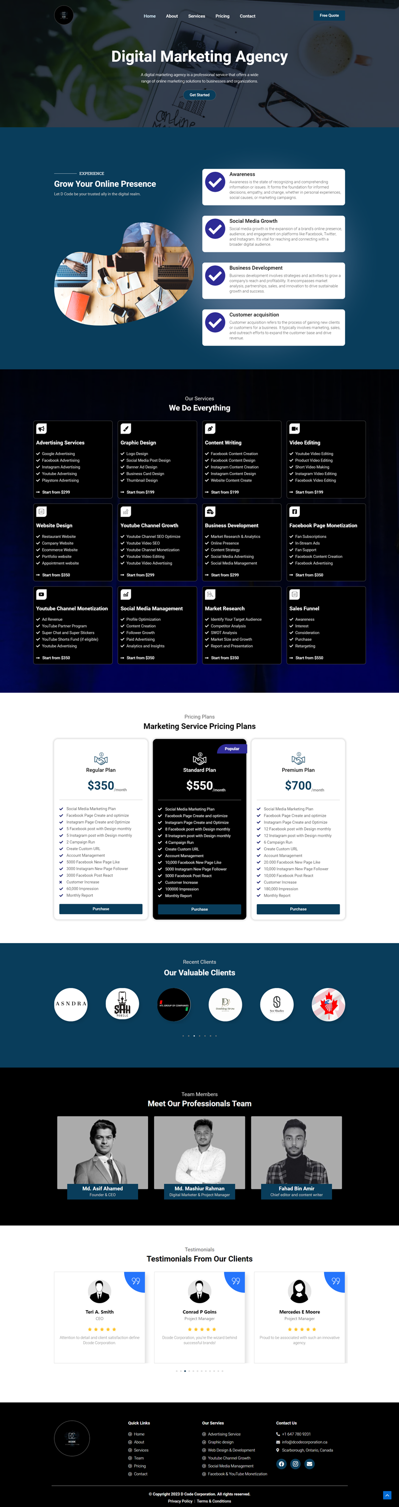 Website Design and Development: We developed a responsive, user-friendly website that highlights D CODE CORPORATION’s services and expertise. The site features an attractive layout with high-quality images, detailed service descriptions, and client testimonials. Additionally, we integrated a portfolio section to showcase past projects, demonstrating their capability and success. Once potential clients visited the website, they were impressed by the professional presentation of services, the portfolio of past projects, and positive client testimonials. The website’s overall appearance and functionality enhanced user experience, encouraging them to consider D CODE CORPORATION for their needs.